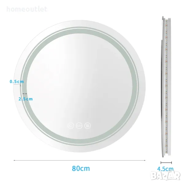Нашето кръгло 80 см огледало има сензорен превключвател, интегриран в стъклото, който реагира на леко докосване с пръст.