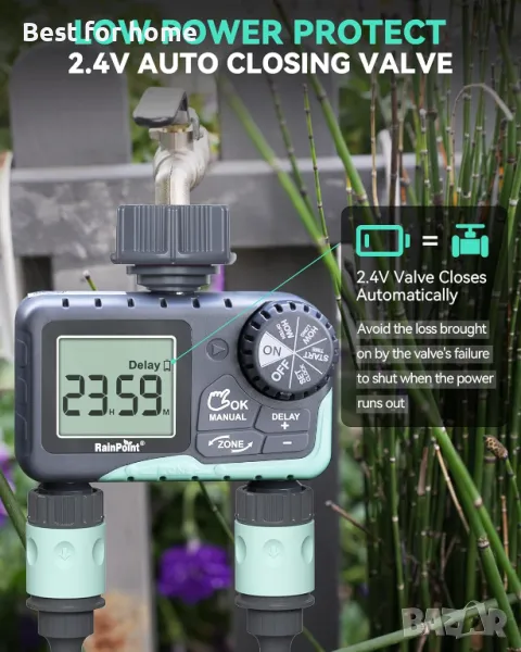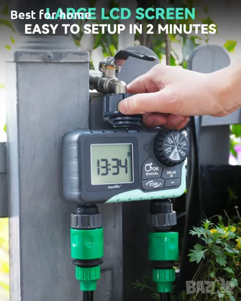 2 ОТДЕЛНИ ПРОГРАМИРУЕМИ ЗОНИ - Таймер за пръскане RAINPOINT с 2 големи изхода (дебит 5-35 L/min), ви позволява да персонализирате графика за поливане (начално време, честота и време на работа) за всяка зона, което ви дава пълен контрол върху поливането на всяка зона от вашия двор и морава, поливайте моравата си равномерно, ефективно и без усилие!