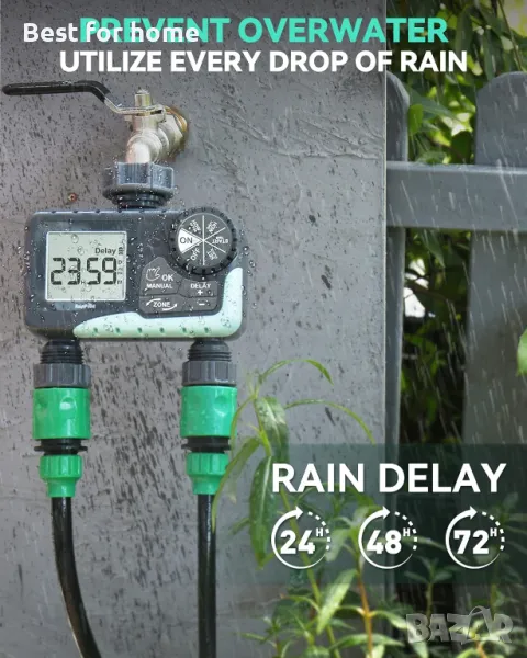 маркуч за поливане разполагат с функция за забавяне на дъжда, която може да бъде настроена да пропуска поливането за 24, 48 или 72 часа, без да прекъсва зададената ви програма, за да избегнете преполиване и да спестите много вода в дъждовни дни. Автоматични, ръчни и режими със закъснение при дъжд, за да отговорите на всичките си нужди от поливане.