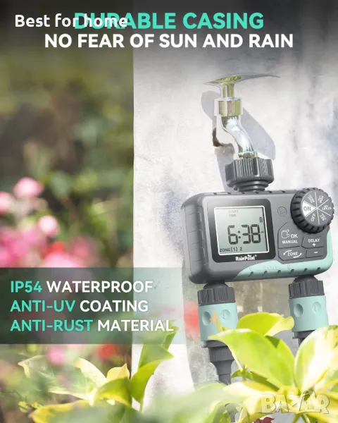 RAINPOINT Таймер за вода за градински маркуч - 2-зонов спринклерен таймер със закъснение при дъжд/ръчно напояване/автоматична система за управление на напояването - Таймер за маркуч за вода Програмируем таймер за кран за дворна морава.