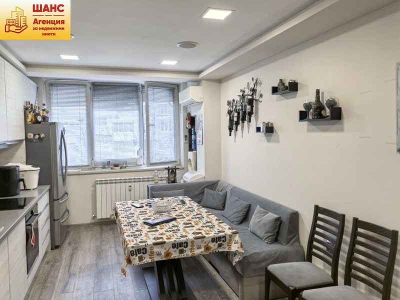 Предлагаме аратамент от генерален ремонт, в непосредствена близост до пощата на комплекса до много търговски обекти и административни сгради, детска градина и училище 'Стоян Заимов', спирки на градски транспорт, на пешеходно разстояние да поликлиниката. Преустроен след ремонта в функционално ,модерно жилище с разпределение: всекидневна с кухненески тракт, две спални, баня и тоалетна, коридор, остъклена тераса, вътрешно на предпочитан етаж, с две изложения - изток и запад. Използвани са висок клас дограми и подови настилки, вътрешна изолация както на стените така и на таваните в цялото жилище, нови ел. уреди в гаранция, нови ВиК и Ел. инсталации, СОД, камера и застраховка на апартамента - предплатени до края на годината. Пред блока, удобен паркинг за живущите. Отлично състояние! Отлични локация и комуникации.