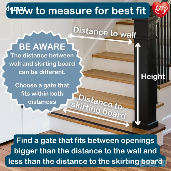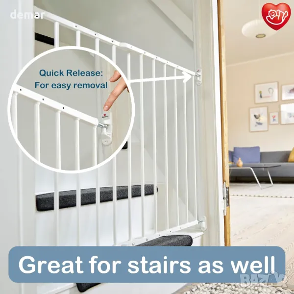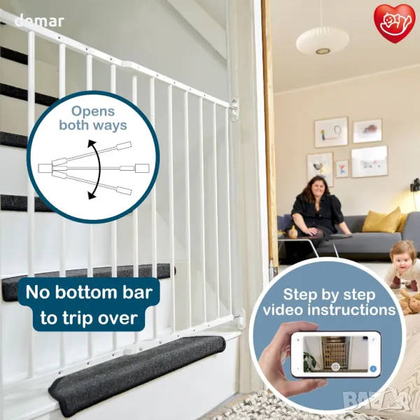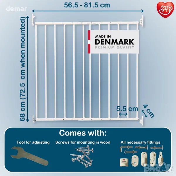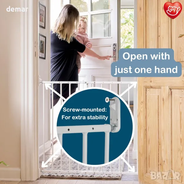 BabyDan MultiDan Stair Gate е здрава предпазна врата, монтирана на стена, предназначена както за тесни, така и за широки пространства, подходяща за отвори от 56,5 до 81,5 cm. Отличава се с лесна работа с една ръка с дръжка, която се отваря в двете посоки, идеална за заети родители. Механизмът за бързо освобождаване позволява бързо отстраняване и повторно закрепване, когато е необходимо, а надеждният дизайн, монтиран на винт, осигурява дълготрайна стабилност. Препоръчва се точно измерване на вашето пространство за най-добро прилягане.
