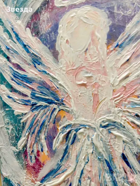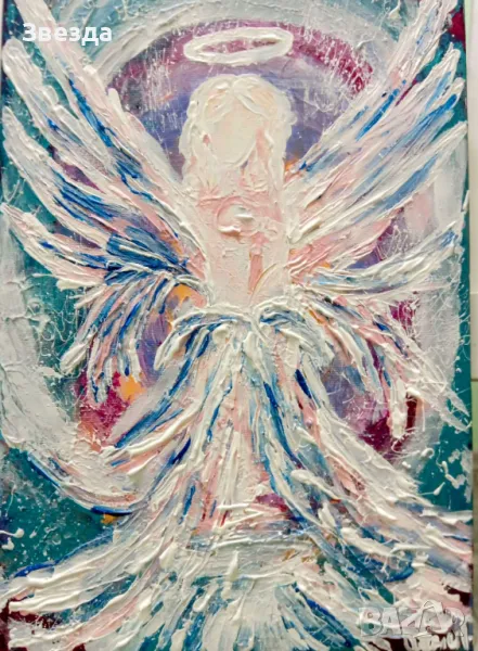 В центъра на картината се извисява ангелска фигура, излъчваща неземно спокойствие и сила. Нежните цветове и изящните щрихи преплитат реалност и фантазия, създавайки усещане за присъствие на висша сила, която бди над нас.