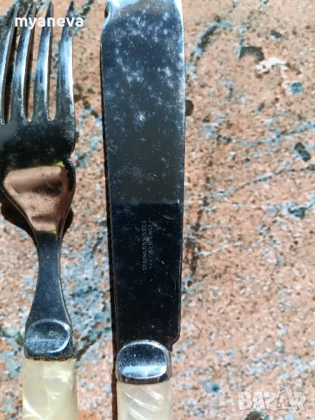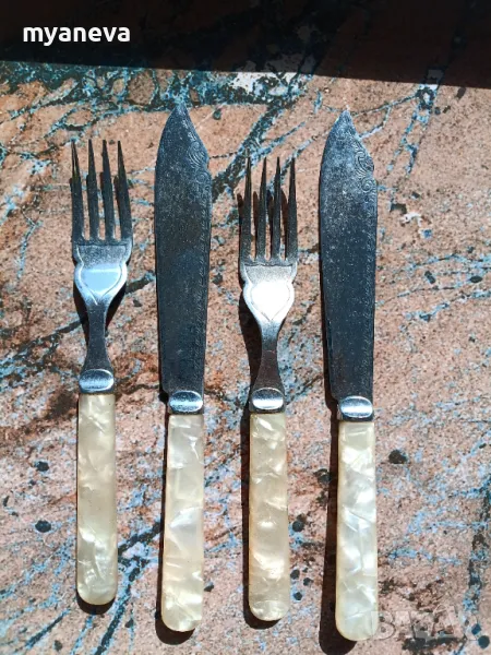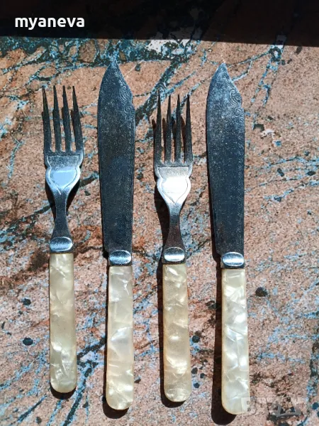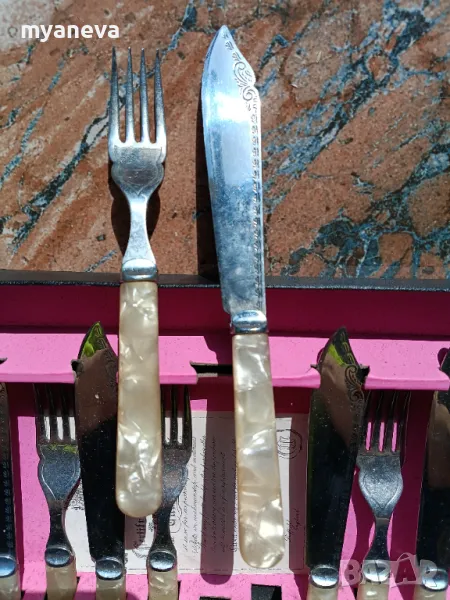 КОМПЛЕКТ ОТ 12 ВИНТИДЖ ХРОМИРАНИ НОЖОВЕ И ВИЛИЦИ ЗА РИБА С ДРЪЖКИ ОТ СЕДЕФ → Обява 49680782