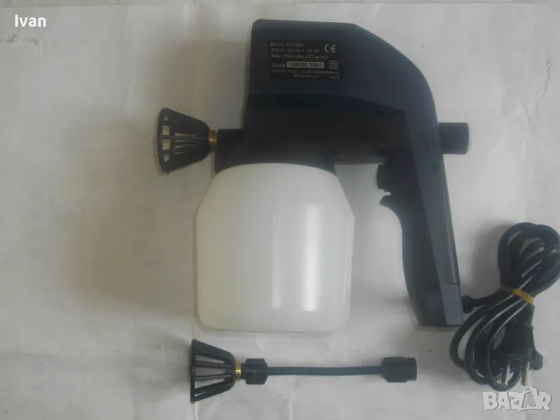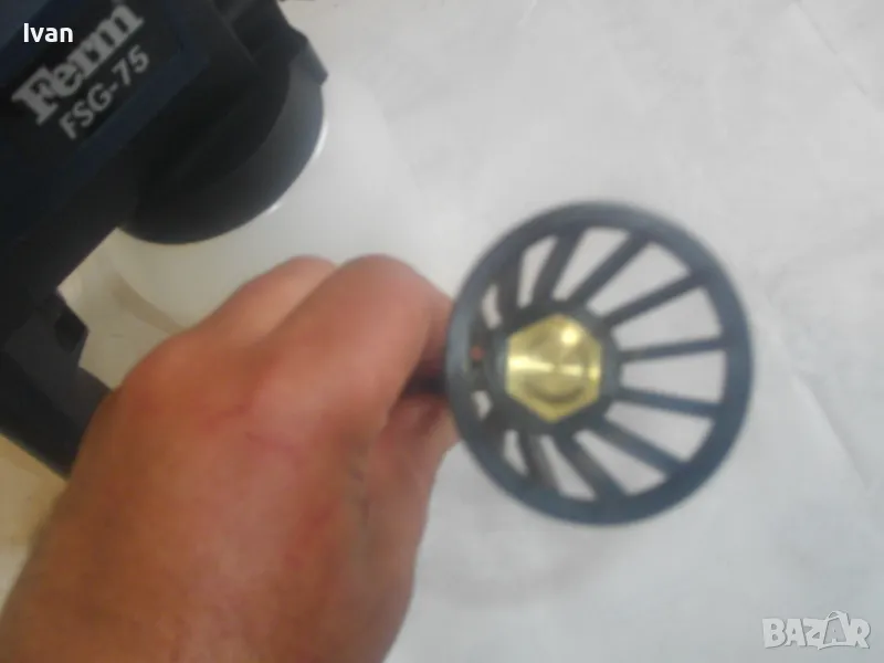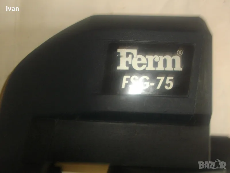 бояджийски пистолет, 75 ватов оригинален нидерландски / холандски професионален модел на ФЕРМ, заедно с 2 различни дюзи. Марка и модел на машината FERM FSG-75. Маркирано производство 2003 г. - оригиналното холандско/нидерландско - NL. Пистолета е пробван от мен с вода - работи много добре ,силно и мощно разпрасква струята. Масивен корпус, стоп спусък с гумирано покритие, реглаж на протика боя, казанче резервоар за боя вместимост 1 л. Характеристики на машината: 75W, max 75 g/min. Поставена дюза с маркиран размер 6, нова резервна дюза също размер 6, с дълго рамо. голяма широка мрежеста цедка за боята в резервоара. Захранващ кабел 2,5 м. Тегло на машината 2,5 кг.