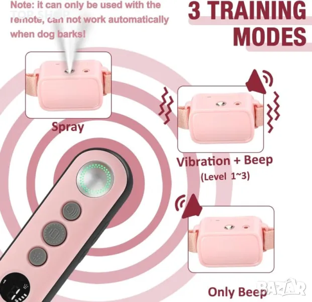 Този нашийник със спрей от цитронела е безопасен, ефективен и хуманен инструмент за обучение, който излъчва взрив от спрей от цитронела, вибрация и звуков сигнал за бързо спиране на нежелано поведение. Разполага с 3 режима на обучение (Citronella Spray + Beep, Vibration + Beep, само Beep) и 3 нива на пръскане (високо/ниско/без пръскане), управлявани от дистанционно с обхват до 300 метра. Нашийникът е регулируем за кучета над 3,6 кг (20-69 сантиметра дължина) и включва зареждане с голям капацитет от 30-35 спрейове (300-400 спрейове/кутия). Има издръжлива акумулаторна батерия, която се зарежда напълно за 2-3 часа и издържа до 11 дни за нашийника и 27 дни за дистанционното. Забележка: Не е водоустойчив, избягвайте употреба при дъжд или вода. Ниската батерия се обозначава с мигаща червена светлина.