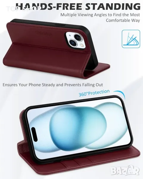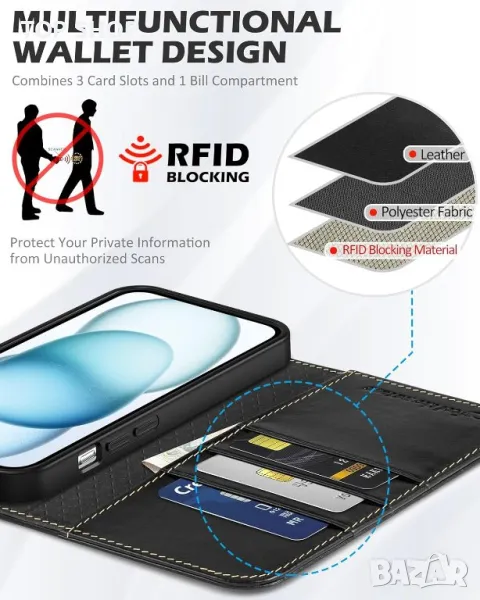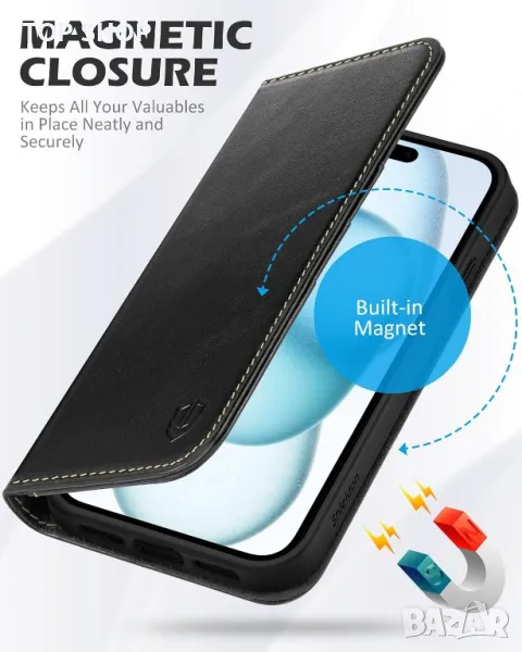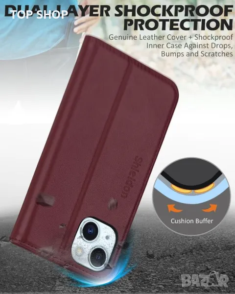 калъфът SHIELDON предлага елегантна повърхност против надраскване за вашия iPhone, подобряваща се с употреба. Не само стилен аксесоар, но и функционира като портфейл с три слота за карти, отделение за пари и усъвършенствана технология за блокиране на RFID за защита на вашата лична информация. Издръжливата мека TPU вътрешна обвивка осигурява удароустойчива защита срещу надраскване, изпускане и удари, с увеличени устни около обектива за защита на камерата. Калъфът също така разполага с невидима стойка за регулируема видимост, сигурно магнитно затваряне и прецизни изрези за непрекъснато използване на портове и функции, гарантиращи практичност заедно със защита на цялото тяло.