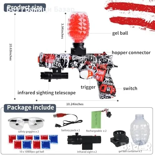 Комплектът включва: 2 електрически гел бластъра, 100 000 гел топчета, 2 батерии, 2 USB кабела, 2 бутилки, очила и упътване