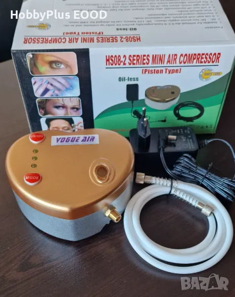 Аерограф с компресор, в пълен комплект, готов за работа. Сипвате боята/лака, включвате и започвате да рисувате.