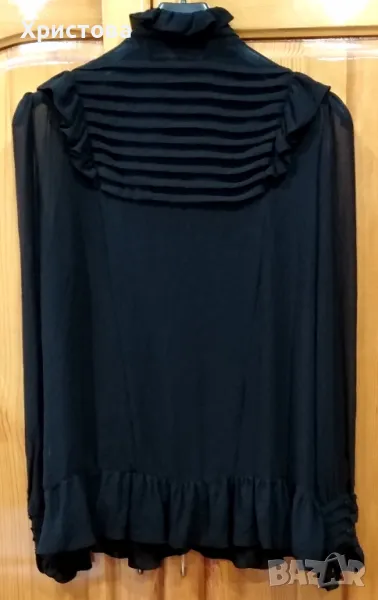 Черна елегантна, ефирна блуза на ZARA, размер по етикет L. Блузата е с красиви декоративни хоризонтални плисета отпред и в горната част на гърба, с къдри край тях и в долния край, с дълъг ръкав (завършващ с голям маншет).,с висока яка.