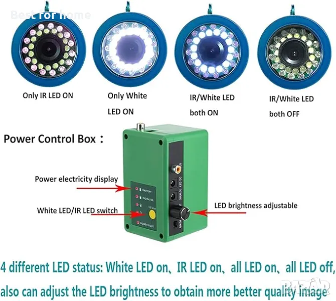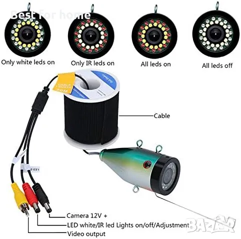 【30 БР. Регулируеми светодиодни светлини】— 15 бели светодиода, 15 инфрачервени светлини, има 4 различни светодиодни статуса, които се регулират според подводната светлинна среда. Рибите ще се виждат по-ясно в тъмна среда. Моля, обърнете внимание: изображението ще стане черно-бяло, ако отворите инфрачервената светлина.