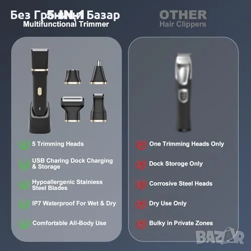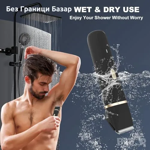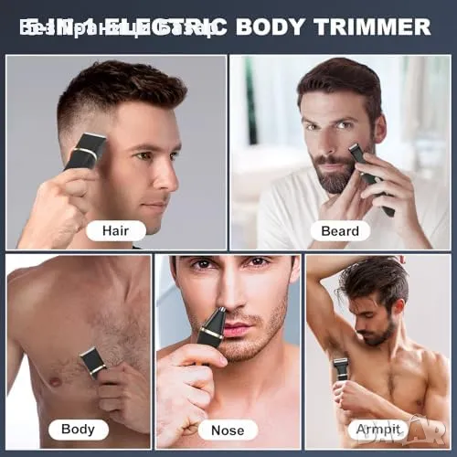 Нов мъжки Електрически тример за тяло и брада – IPX7, 5 приставки, черен