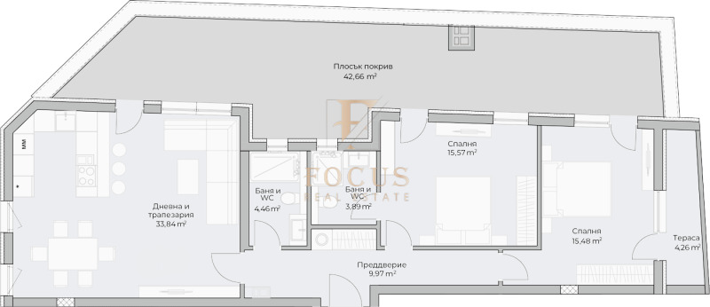 Апартаментът е с площ от 105,35 кв.м. със следното разпределение: антре, хол с кухненски бокс, две спални, две бани с тоалетни и две тераси - 50,12 кв.м.