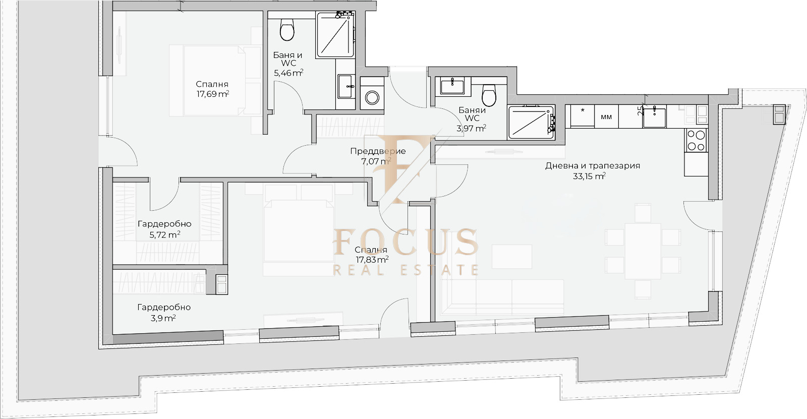 Апартаментът впечатлява с функционално разпределение и изключително просторна тераса, която създава усещане за допълнително жилищно пространство.