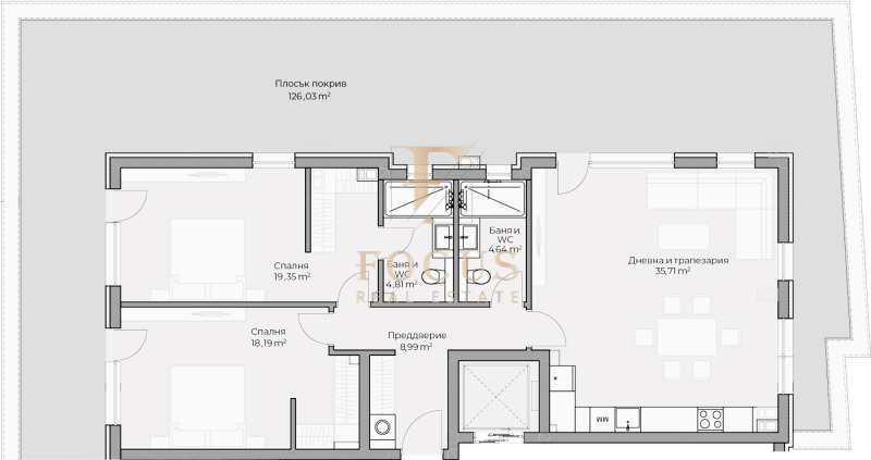 Апартаментът е с площ от 109,97 кв.м. със следното разпределение: антре, хол с кухненски бокс, две спални с гардеробни, две бани с тоалетни и тераса - 98,18 кв.м.