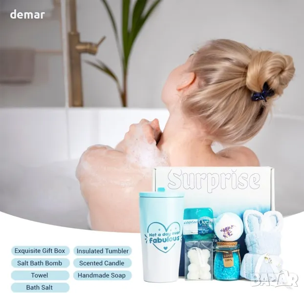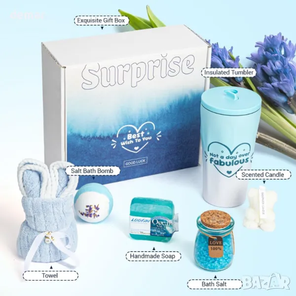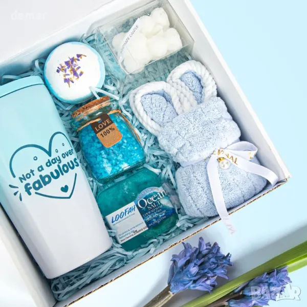 Този подаръчен комплект за глезене предлага пълноценно домашно спа изживяване с бомби за баня, ароматна свещ във формата на мече и ръчно изработен сапун от луфа, всички създадени да релаксират и освежават. Включва изолирана чаша от 568 ml, която поддържа напитките топли или студени, добавяйки практичност към удоволствието. Всеки артикул е внимателно изработен и красиво аранжиран в персонализирана подаръчна кутия, което го прави идеален избор за рождени дни, пакети за грижи или всеки специален повод, когато искате тя да се почувства оценена.