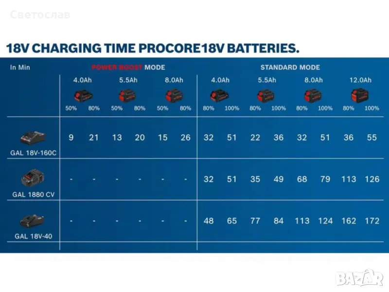 Време на зареждане ProCORE18V 4.0Ah (80 %/100 %) прибл.32/51min