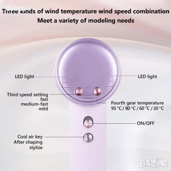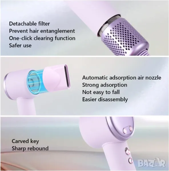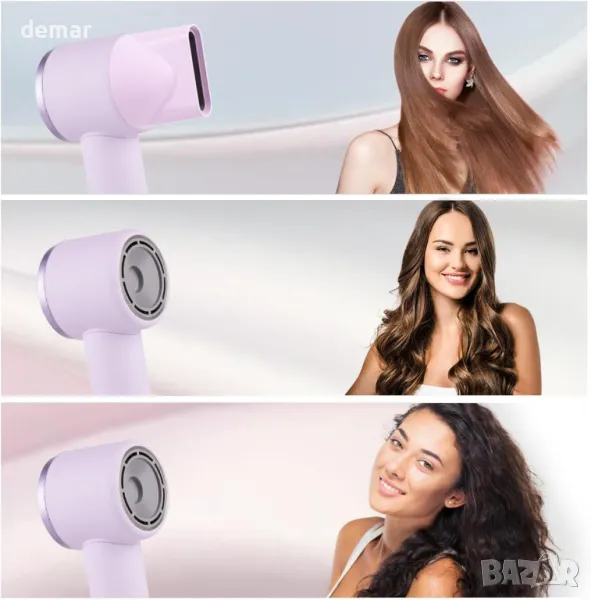Оборудван с двигател със 110 000 RPM, този сешоар осигурява силен въздушен поток за бързо изсушаване само за 2–5 минути, докато 200 милиона отрицателни йони помагат за намаляване на къдренето, задържане на влагата и придаване на блясък. Отличава се с ниско ниво на шум при само 51 dB благодарение на технологията за наслоено шумопоглъщане и предлага управление с бутон с 4 настройки на топлината и 3 нива на скорост, за да предпази косата от увреждане от топлина. Лек само 424 грама, той е ергономично проектиран за комфорт, удобен за пътуване и включва въртяща се на 360° магнитна дюза, подходяща за всички типове коса.