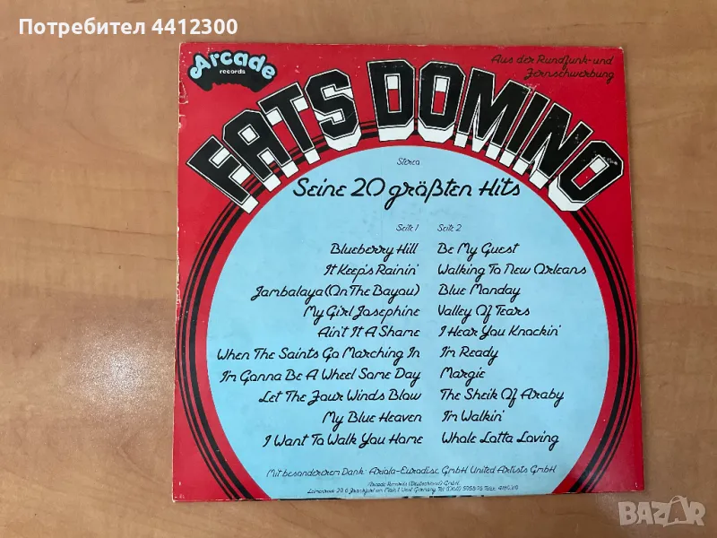Здравейте, грамофонна плоча 12 инча Fats Domino. Не нося отговорност за състоянието на плочите, не почиствам плочи. Вие поемате риск, когато закупувате от мен, ако имате въпроси, може да ми звънете на посочения номер или да ми напишете съобщение. Отговарям след 18 часа, цените не се коментират, ако не се вземат повече от 10 плочи. Благодаря, че прегледахте обявата ми. Лек и спокоен ден!