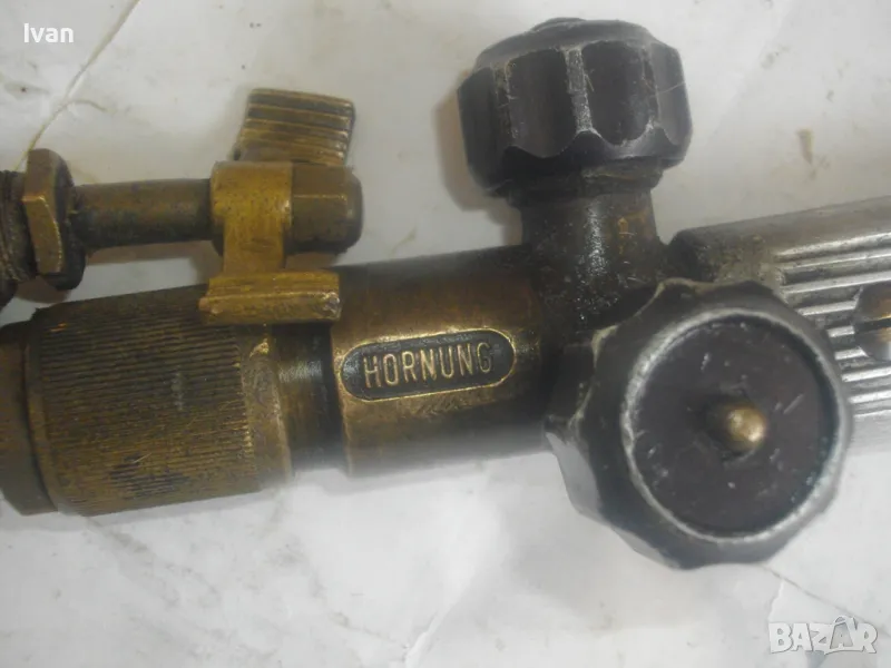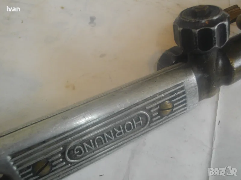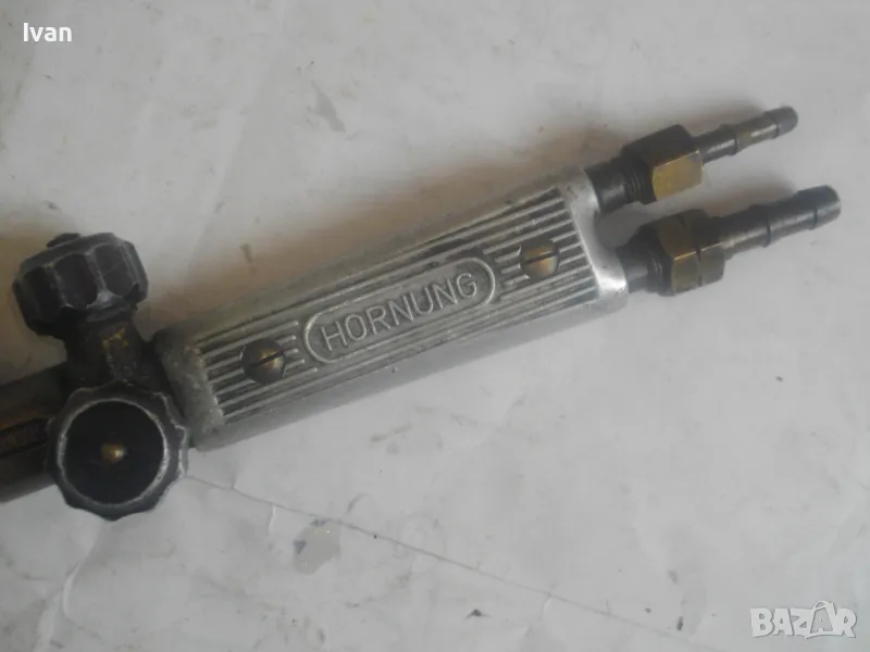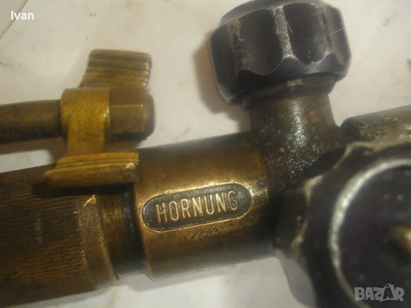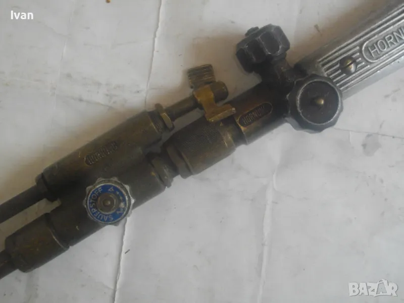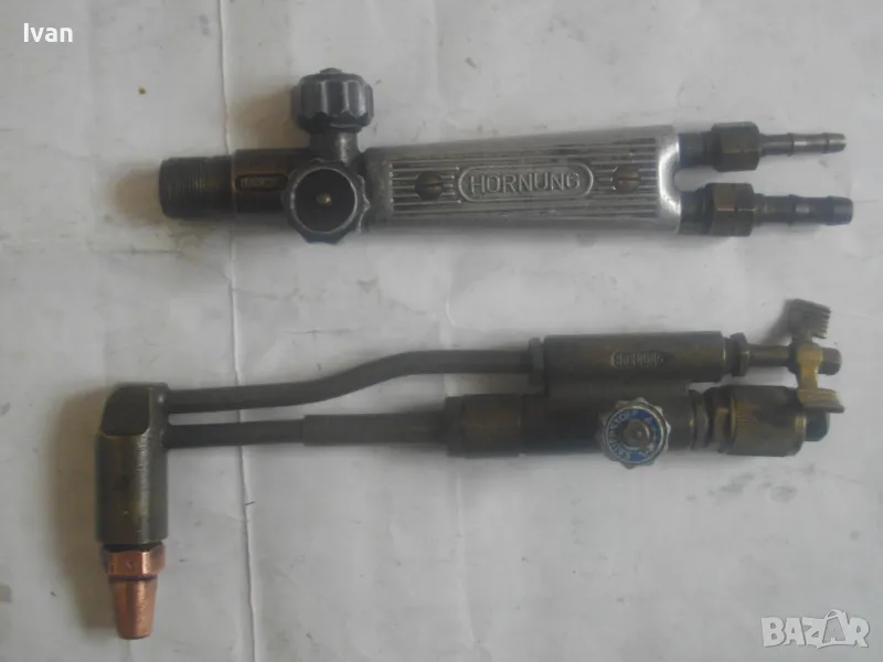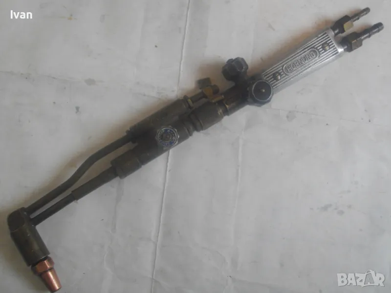 резак от старото немско професионално производство, модел на HORNUNG. Резака е ползван, но е в отлично работно състояние. Въртоците спирателни кранове затварят и отварят плътно, без изпускане и пропускане. Резбите на щуцерите и приставката резак на бренера дръжка вървят много добре, съвсем леко без запъване. Алуминиева олекотена дръжка бренер, стандартна за горелки и приставки резаци на марката и съвместима с много други немски брандове от старото немско производство. Приставка резак оригинална на HORNUNG, скачена на дръжката. Резака е изцяло от месинг, с медна голяма контактна дюза отпред с множество отвори за пламъка. Спирателен алуминиев кран на резака и месингов върток врътка кран. На дръжката още 2 спирателни крана - алуминиеви.Поставени дълги оригинални бронзови щуцери накрайници за скачване с маркучи на оксижен. Цялостна дължина резака с щуцерите - 50 см. Тегло - 2,0 кг. Цена - 249 лв.