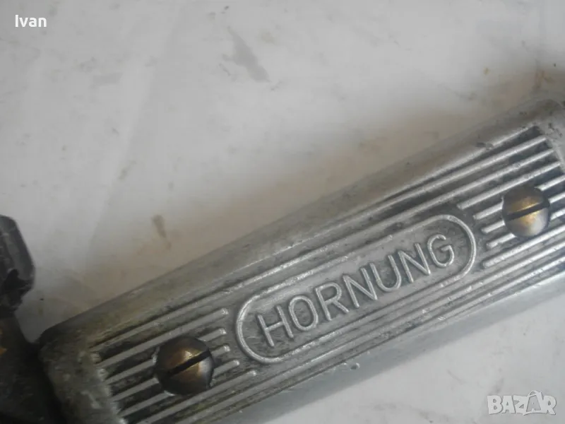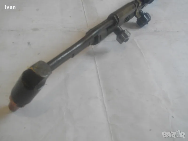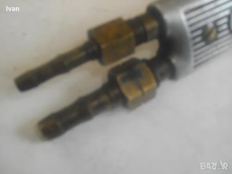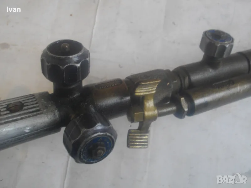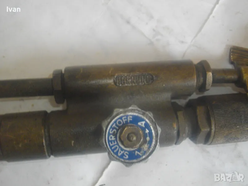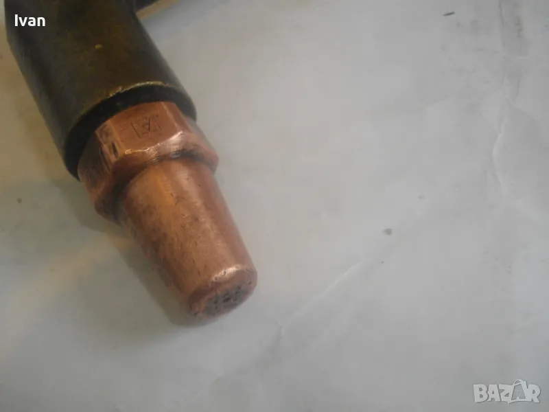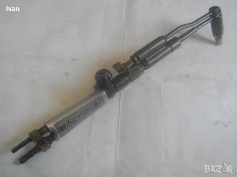 резак от старото немско професионално производство, модел на HORNUNG. Резака е ползван, но е в отлично работно състояние. Въртоците спирателни кранове затварят и отварят плътно, без изпускане и пропускане. Резбите на щуцерите и приставката резак на бренера дръжка вървят много добре, съвсем леко без запъване. Алуминиева олекотена дръжка бренер, стандартна за горелки и приставки резаци на марката и съвместима с много други немски брандове от старото немско производство. Приставка резак оригинална на HORNUNG, скачена на дръжката. Резака е изцяло от месинг, с медна голяма контактна дюза отпред с множество отвори за пламъка. Спирателен алуминиев кран на резака и месингов върток врътка кран. На дръжката още 2 спирателни крана - алуминиеви.Поставени дълги оригинални бронзови щуцери накрайници за скачване с маркучи на оксижен. Цялостна дължина резака с щуцерите - 50 см. Тегло - 2,0 кг. Цена - 249 лв.