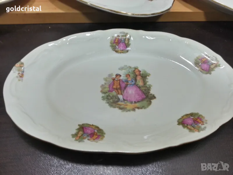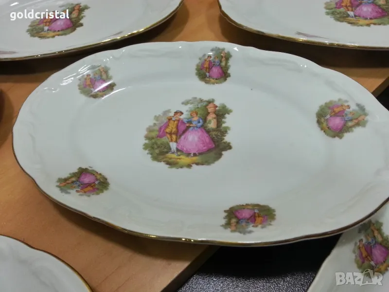 Стар български порцелан Изида барок златен кант елипси Ромео и Жулиета 6 броя и седма подарък с липсваща картинка сервиз комплект сет лот ретро арт декор винтидж колекция стари старинни антикварни предмети обзавеждане за дома и семейството подходящи за подарък за ценители и колекционери