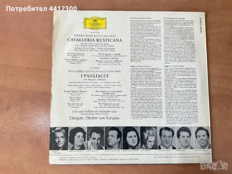 Здравейте, грамофонна плоча 12 инча Von Karajan cavaleria rusticana. Не нося отговорност за състоянието на плочите, не почиствам плочи. Вие поемате риск, когато закупувате от мен, ако имате въпроси, може да ми звънете на посочения номер или да ми напишете съобщение. Отговарям след 18 часа, цените не се коментират, ако не се вземат повече от 10 плочи. Благодаря, че прегледахте обявата ми. Лек и спокоен ден!