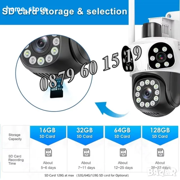 - Памет и съхранение: Слот за TF карта до 128 GB с криптиране и възможност за облачно съхранение. Отдалечен преглед чрез приложението iCSee, XMeye, XMEye Pro на смартфон.