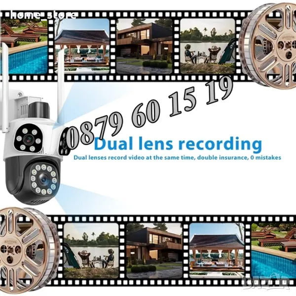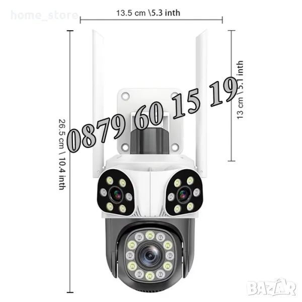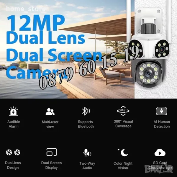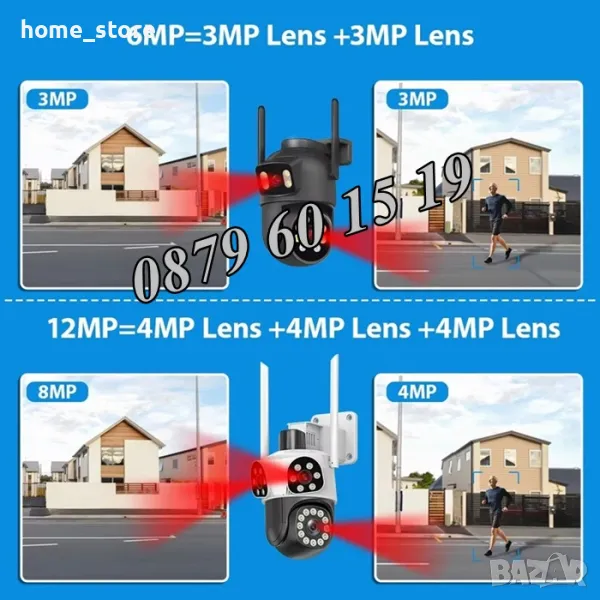 Нов модел иновативна двойна външна WiFi камера с Ultra HD резолюция. Три камери в един корпус: Стационарни и ротационна (въртяща се). 12 Mpx резолюция и за трите обектива. 10X зуум увеличение. Auto tracking функция за хоризонтално проследяване на движение от ротационната камера. Вграден високочувствителен цифров микрофон за аудио мониторинг и говорител за двупосочна аудио връзка. 24 броя High Power LED осветители за цветно нощно виждане до 30 метра. Функция за хоризонтално и вертикално проследяване на движението на ротационната камера. Слод за micro SD карта до 128GB. Безплатно мобилно приложение за iPhone и Android - ICSee, XMeye, XMEye Pro за отдалечено наблюдение в реално време и преглед на записите. Завъртане от мобилен телефон по хоризонтала на 270° и по вертикала на 90°. Широкоъгълни обетиви с фокусно разстояние 3.6мм на трите камери, с хоризонтален ъгъл на сцената 90° на стационарните и 120° на въртящата се камера. Функционална стойка даваща възможност за лесен монтаж на таван или стена. Камерата разполага с три нощни режима на работа: Цветен нощен режим, черно-бял нощен режим и цветен нощен режим при движение.