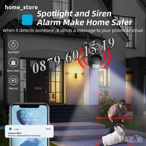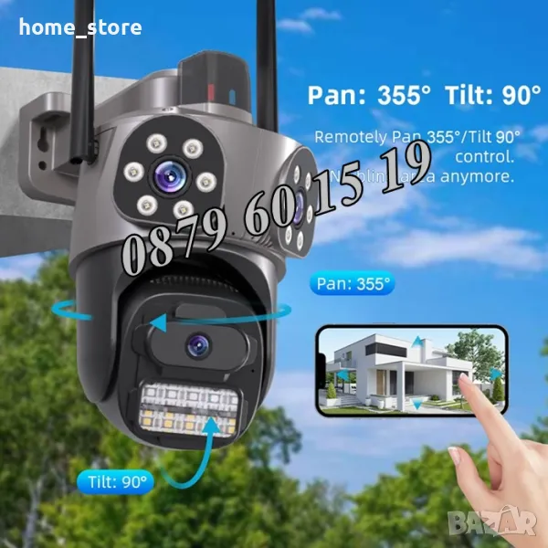 - Широк обхват на виждане: Въртене на 270 градуса хоризонтално и наклон на 90 градуса вертикално. Поддържа двупосочен аудио разговор в реално време и функции за откриване на движение и аларма.