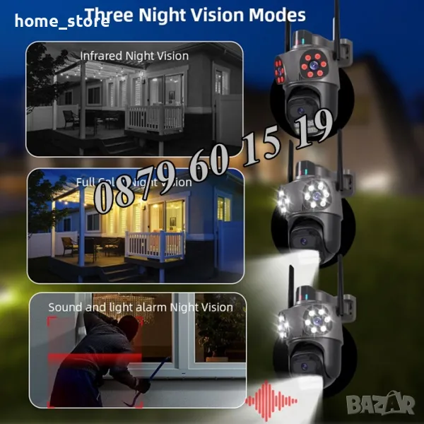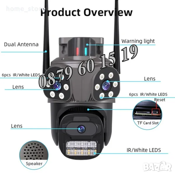 Нов модел иновативна двойна външна WiFi камера с Ultra HD резолюция. Три камери в един корпус: Стационарни и ротационна (въртяща се). 10 Mpx резолюция и за трите обектива. Auto tracking функция за хоризонтално проследяване на движение от ротационната камера. Вграден високочувствителен цифров микрофон за аудио мониторинг и говорител за двупосочна аудио връзка. High Power LED осветители за цветно нощно виждане до 30 метра. Функция за хоризонтално и веетикално проследяване на движението на ротационната камера. Слод за micro SD карта до 128GB. Безплатно мобилно приложение за iPhone и Android - ICSee, XMeye, XMEye Pro за отдалечено наблюдение в реално време и преглед на записите. Завъртане от мобилен телефон по хоризонтала на 270° и по вертикала на 90°. Широкоъгълни обетиви с фокусно разстояние 3.6мм на трите камери, с хоризонтален ъгъл на сцената 90° на стационарните и 120° на въртящата се камера. Функционална стойка даваща възможност за лесен монтаж на таван или стена. Камерата разполага с три нощни режима на работа: Цветен нощен режим, черно-бял нощен режим и цветен нощен режим при движение.