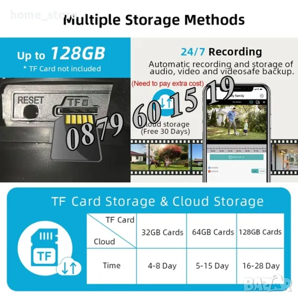 - Памет и съхранение: Слот за TF карта до 128 GB с криптиране и възможност за облачно съхранение. Отдалечен преглед чрез приложението iCSee, XMeye, XMEye Pro на смартфон.