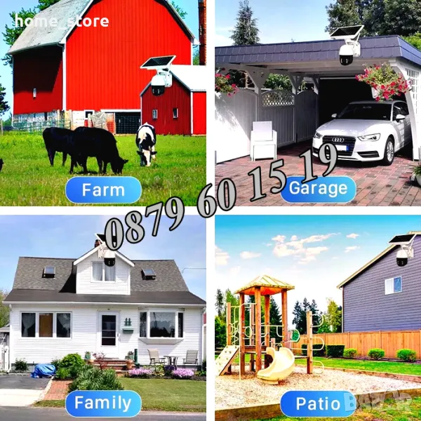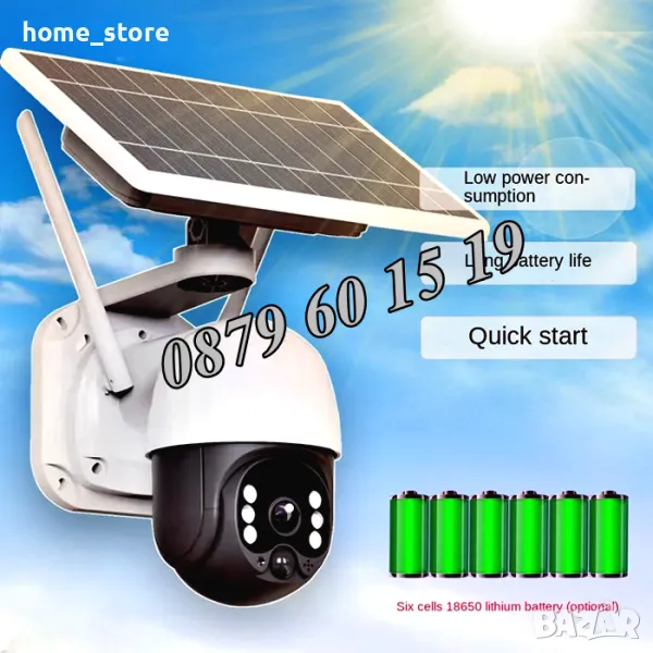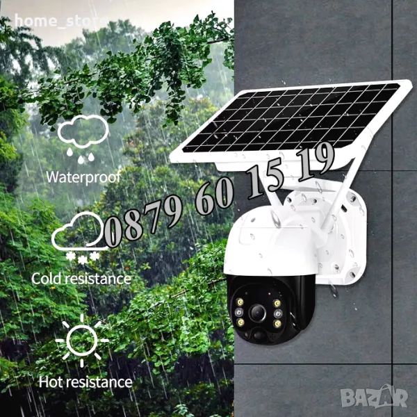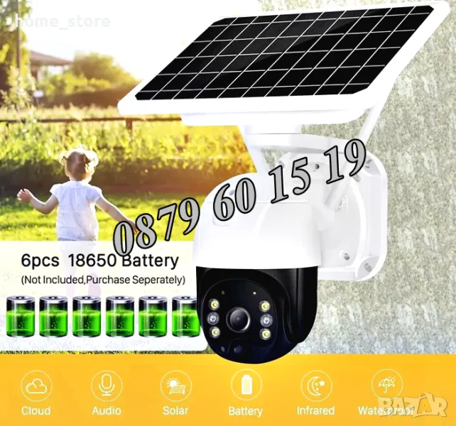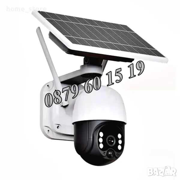 Соларна камера за видео наблюдение, със захранване от соларен (фотоволтаичен) панел. Камерата може да бъде поставена външно, без нуждата от окабеляване. Клас IP66. Прахо и влагоузтоичива.