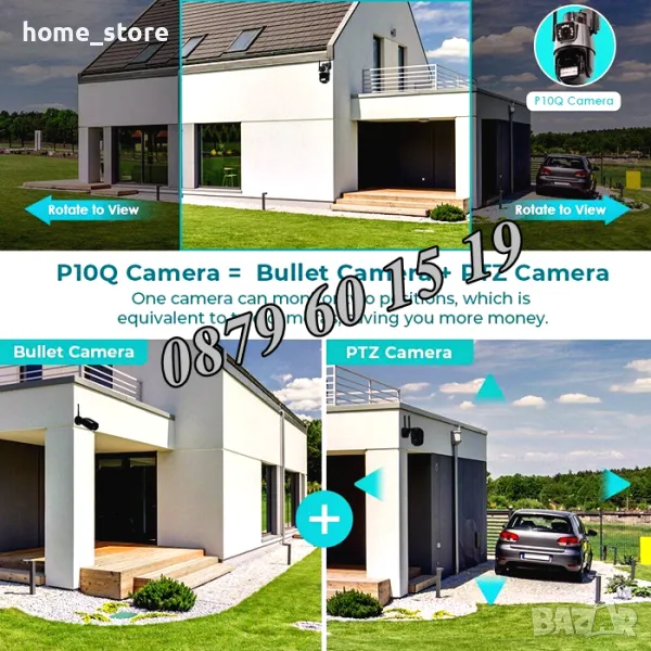 Pan 270 градуса / наклон 90 градуса. Двупосочен аудио разговор говори в реално време. Функция за откриване на движение и аларма.