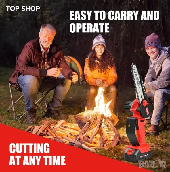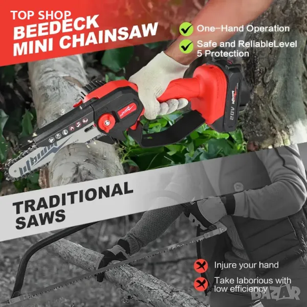 акумулаторен верижен трион разполага с технология за остър чип и висококачествен мотор от чиста мед за ефективно рязане, постигайки скорост на веригата от 19,2 фута/сек за рязане на 6" клони само за 8 секунди. Захранва се от 20V 2000mAh литиева батерия, която зарежда за около 2 часа и осигурява до 30 минути време на работа. Подобрените мерки за безопасност включват превключвател за защита от пръски и пет вида защита срещу проблеми с претоварване, ниско напрежение, късо съединение и температура идеален за различни задачи като рязане на дърва, кастрене на клони и градинарство, което го прави универсален инструмент за всеки любител на Направи си сам или градинар.