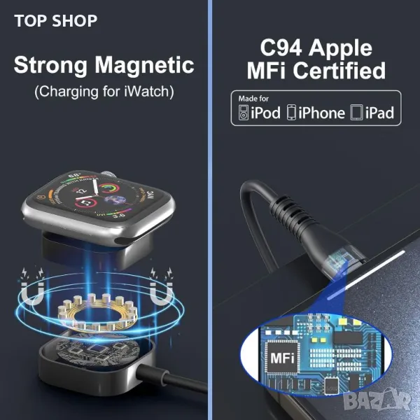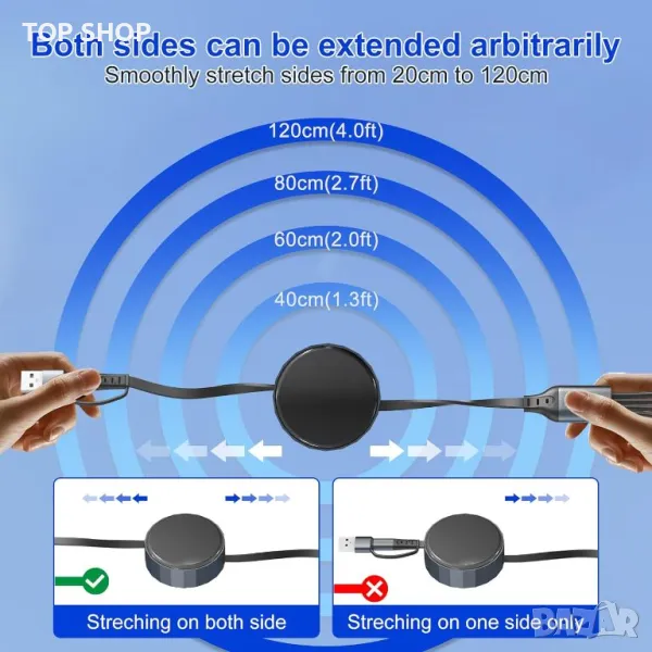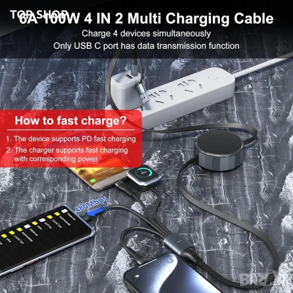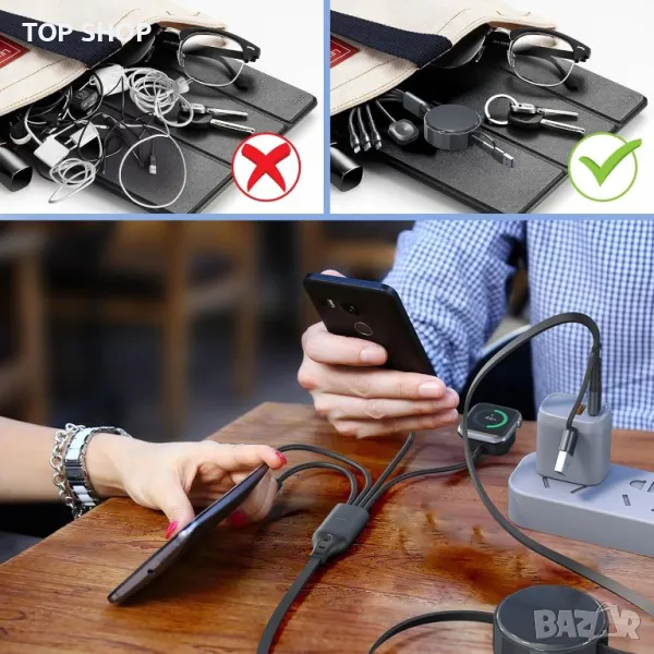 4 в 2 USB A/C прибиращ се многофункционален кабел за бързо зареждане предлага 8 метода за зареждане, включително USB C/A към iWatch, Lightning, Type C и Micro USB. Поддържа зареждане на 4 устройства едновременно, спестявайки място и пари. С помощта на 100W PD технология, той зарежда iPhone 15 Pro до 92% за 35 минути и MacBook Pro до 100% за 1,9 часа. Регулируемата дължина се простира до 1,2 метра и се прибира за лесно съхранение, идеален за пътуване. Магнитното зарядно устройство iWatch е MFi сертифицирано, което гарантира безопасно и съвместимо зареждане за всички серии Apple Watch и различни устройства, включително iPhone, iPad, MacBook и телефони с Android. Издръжлив с медна жица с висока чистота, той гарантира дълготрайна работа.