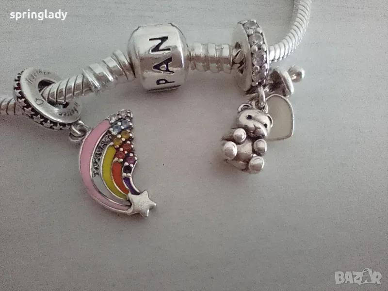 Гривна Пандора с 5 талисмана. Единият има забележка(отчупена частица на дъгата), но не се забелязва, когато се носи на ръката.
