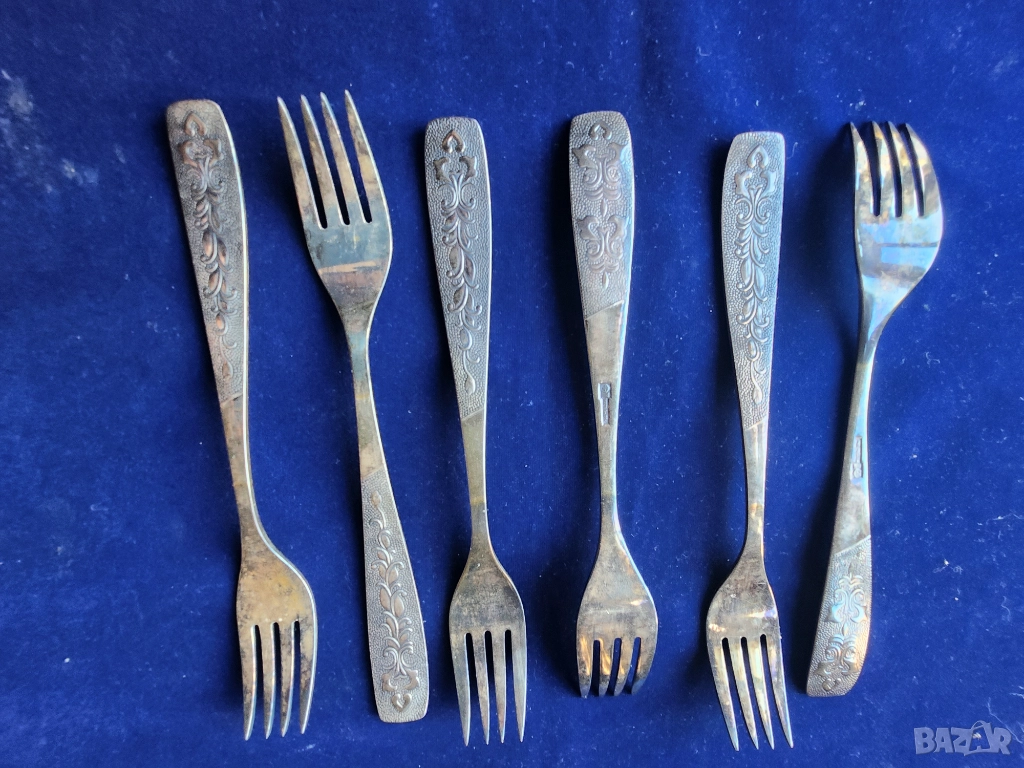 - допълнително от същия модел предлагам чисто нови/неползвани комплект от 6 броя вилици ( посребрени и позлатени с патина от времето)