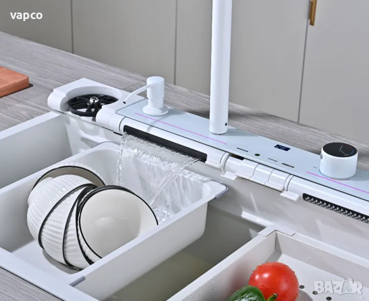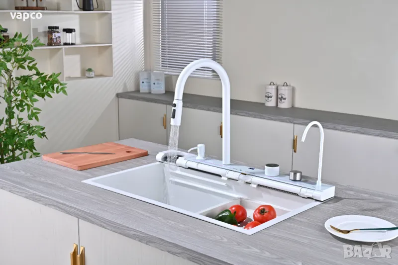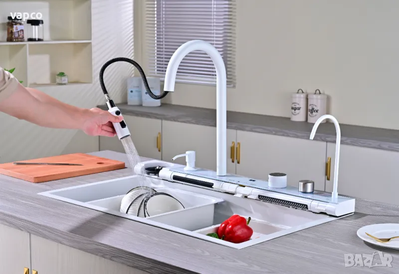 Бяла мултифункционална кухненска мивка с регулируем двоен водопад