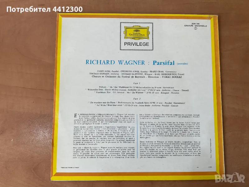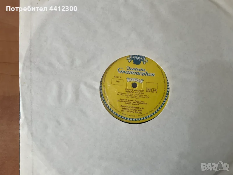 Здравейте, грамофонна плоча 12 инча Richard Wagner - Parsifal, ако имате въпроси, може да ми звънете на посочения номер или да ми напишете съобщение. Отговарям след 18 часа, цените не се коментират, ако не се вземат повече от 10 плочи. Благодаря, че прегледахте обявата ми. Лек и спокоен ден!