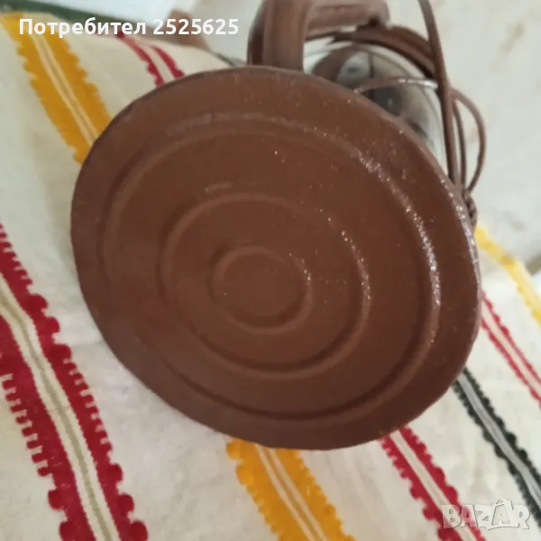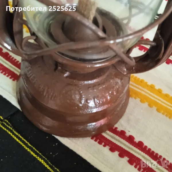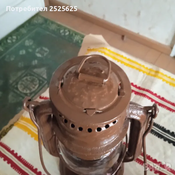 Работещ, изцяло реновирани части, пребоядисан в цвят, като оригинала. Здраво ново стъкло, с фитил. Висок 250 мм. Поставено ново капаче с халка на комина.