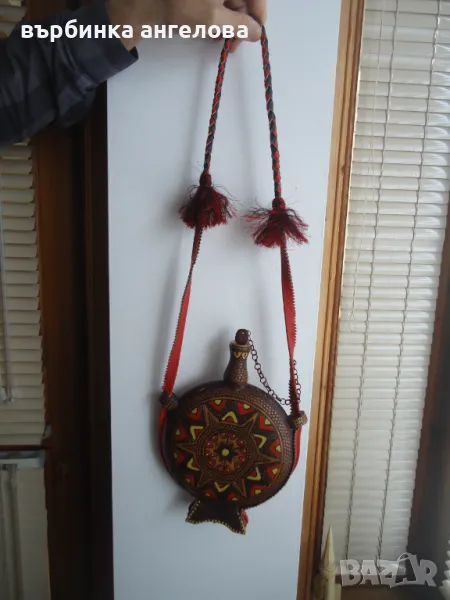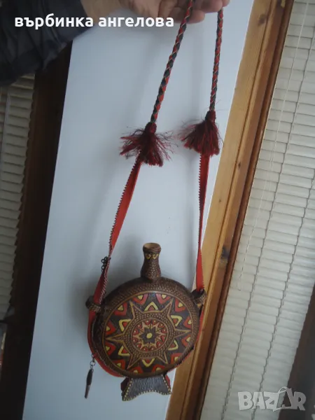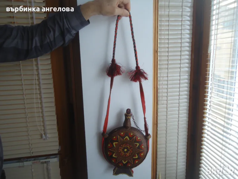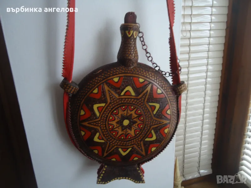 Бъклица от дърво, ръчно рисувана, шарки изработени с пирограф. Дръжката е от кожа, както и кантовете странично и отдолу. Височина 28см,, диаметър на кръглата част 20см. Доставка с ЕКОНТ наложен платеж. Доставката се поема от купувача.