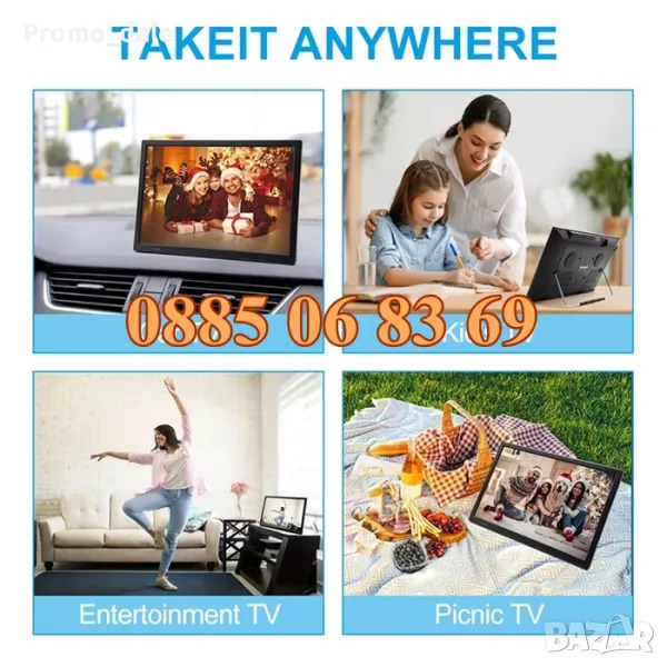 Портативен, лесно преносим Телевизор с цифров тунер и вградена акумулаторна батерия за автономна работа. Подходящ за използване при излет, в каравана, камион, кола, автобус и др. Мултимедийни функции - можете да гледате филми, клипове, да слушате музика и преглеждате снимки. AV вход за подаване на сигнал от външен източник, като DVD, сателитен, кабелен приемник, камера за задно виждане на кола, камион и др.