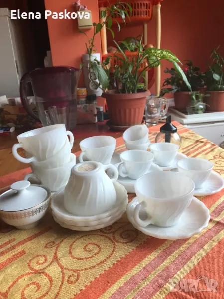 чаши 11 броя, за кафе - 5 бр., 80 мл., диам. чинийки-12 см., диам. чашки-7 см. За чай-6 броя, 150 мл. диам.- чинийка-13 см., Две захарници - стъклена и порцеланова. Цена обща- 40 лв. Еконт, Спиди, за София - лично предаване пред входа на Билла, бул. България.