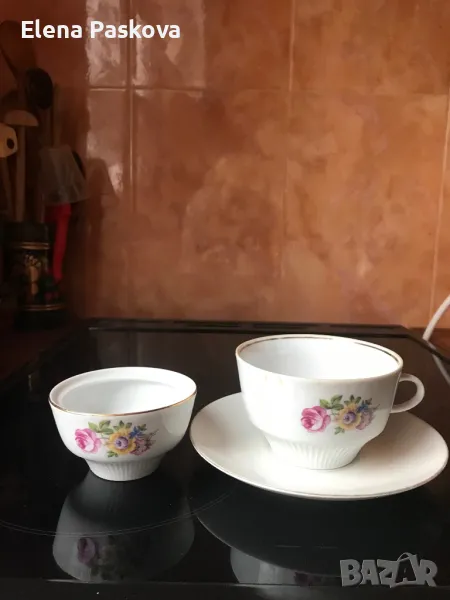 Порцелан чаша 200 мл. чиния и захарница. Добро състояние. Ретро стил. Цена 10 лв. Еконт, Спиди, за София-лично предаване пред входа на Билла, бул. България.