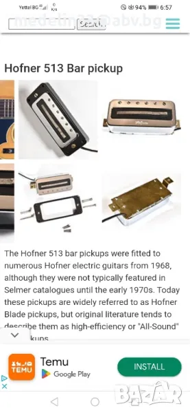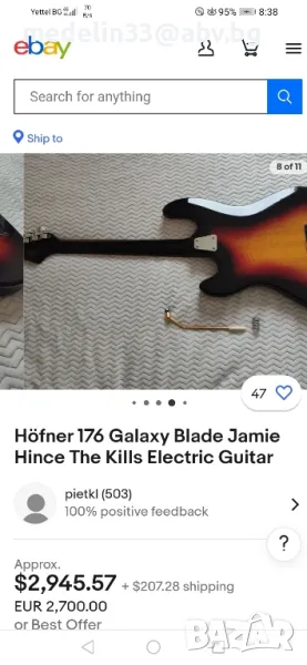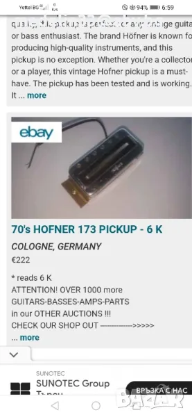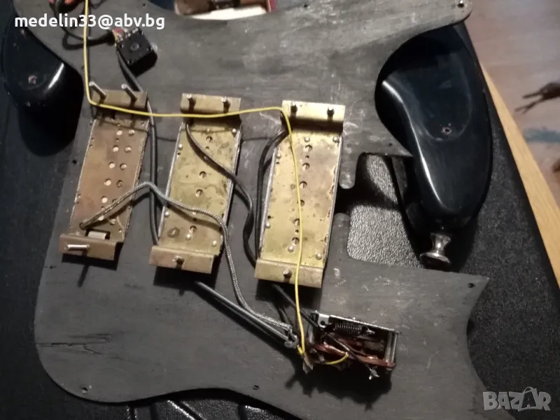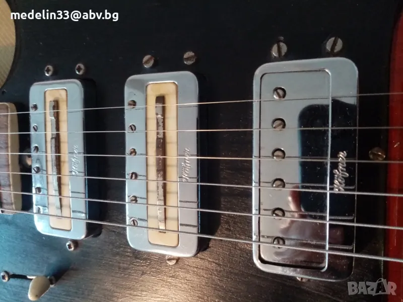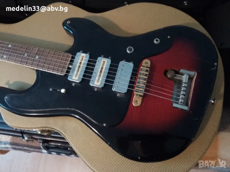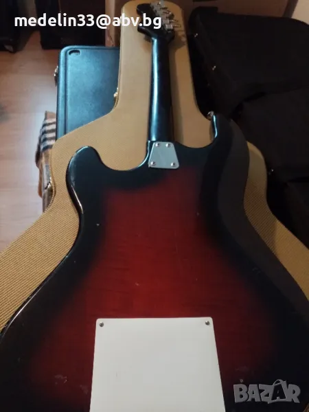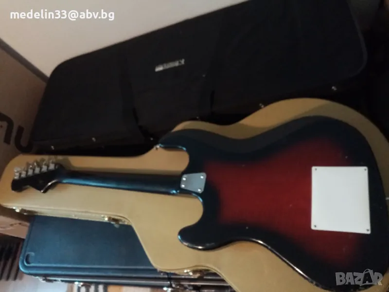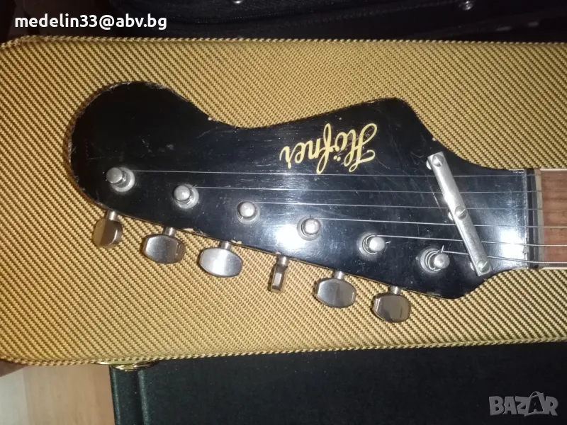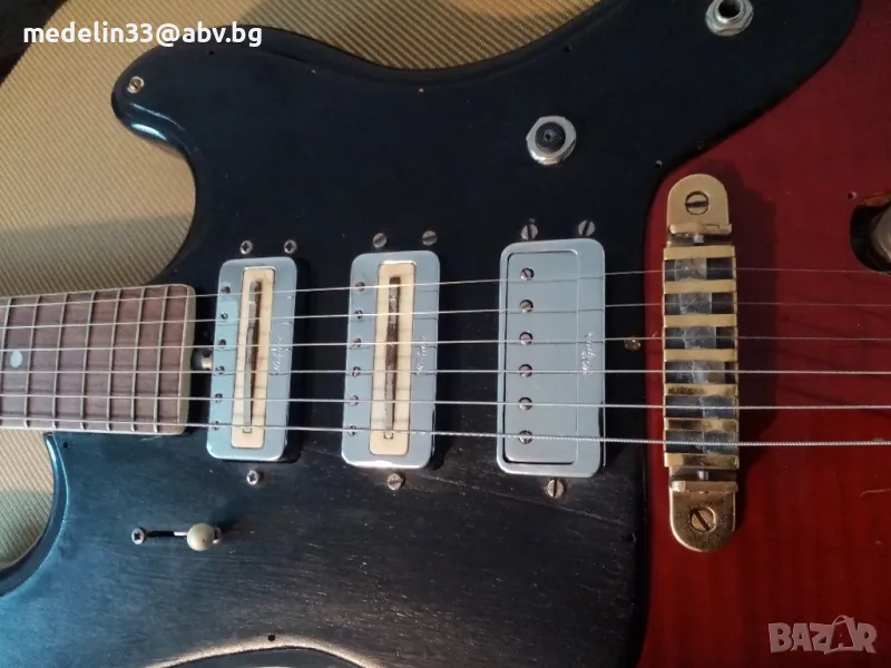На всички колекционери и китаристи предлагам една стара машина на времето Hofner Stratocaster HSS от 1967 г. Всичко по нея е оригинално без замени и подобрения, така както е произведена в Германия. Изключително рядък модел. Имам много снимки в разглобен вид, но тук има ограничение за броя, който прояви интерес мога да изпратя по вайбър. Рядкостта на модела се състои в това, че е правена по поръчка, Custom shop. Няма традиционните потенциометри за волюм и тон, пикгарда е изцяло от дърво, 4 мм дебел, тремолото е блокирано, но може да се разблокира и да се ползва, ако се намери подходяща дръжка. Бриджа и тремолото са месинг и хром, пикгарда отдолу е фабрично екраниран със специална графитна боя. Грифа е много удобен, изтънен, няма радиус отгоре, подобно на Gibson моделите. Тръс рода работи и се регулира откъм тялото. Ключовете са оригинални и перфектни, държат чудесно, нъта е месингово графитен. Никога не съм срещал такъв. Има ключ за превключване на бридж адаптера от хъмбакер на сингъл, който като единственна забележка на
