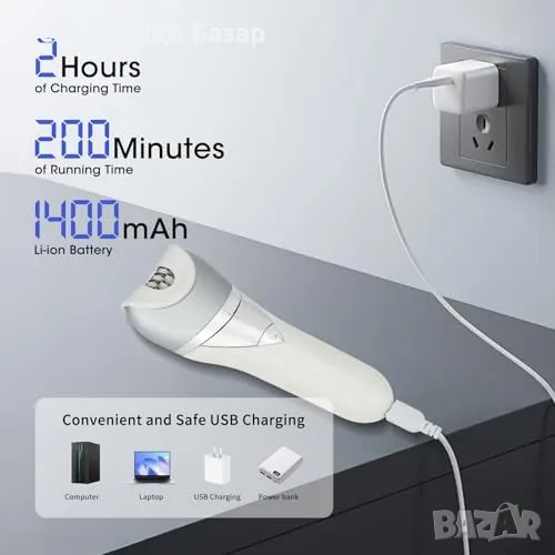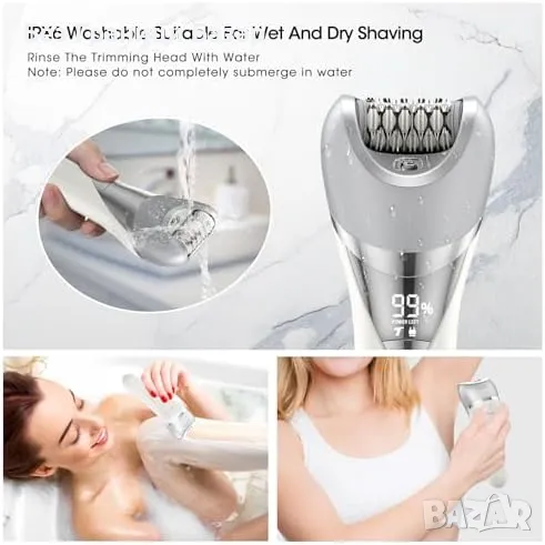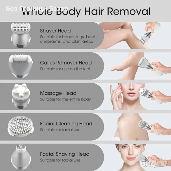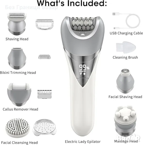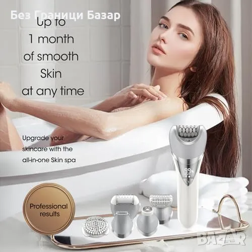 7-в-1 уред: епилатор, бръсначка, тример, тример за лице, масажор, четка за почистване, ексфолиатор за пети