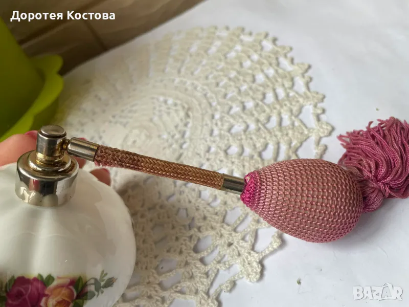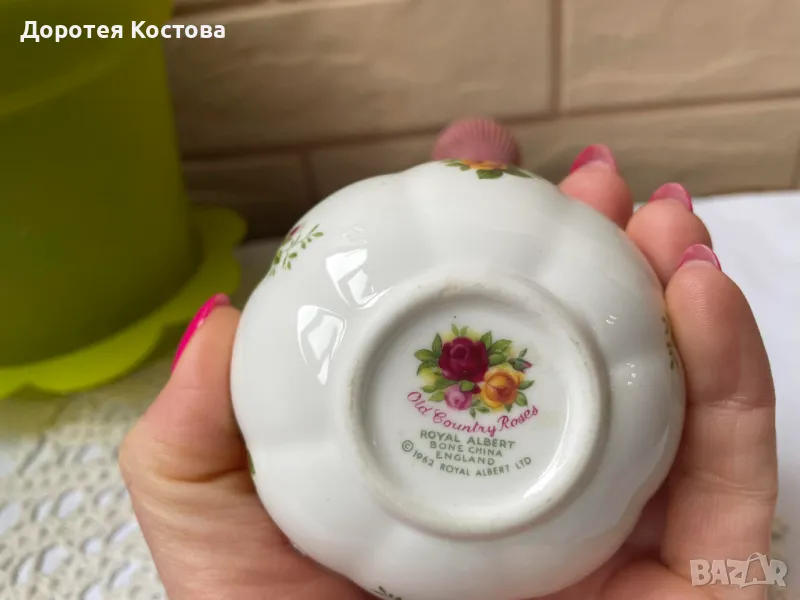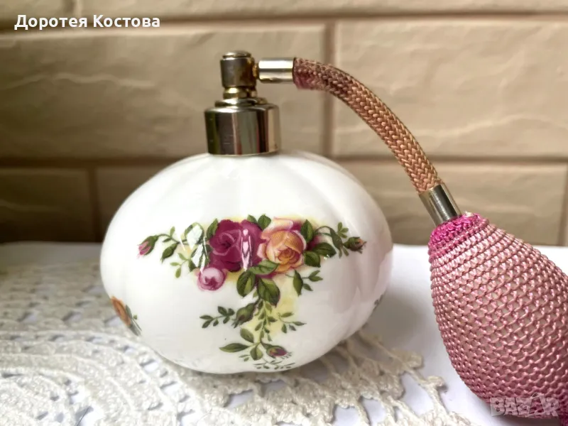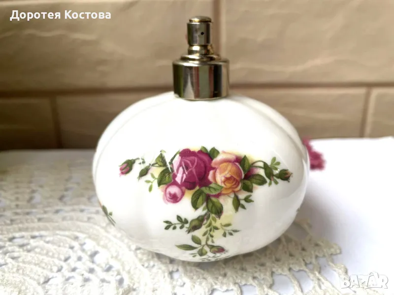 ROYAL ALBERT красиво шишенце за парфюм от костен порцелан от Англия, най-известната им серия - Стари селски рози, с маркировки, размерите са на снимките. Без забележки по порцелана, става както за декорация, така и за употреба, напълно работещо е. Цена - 70 лв.