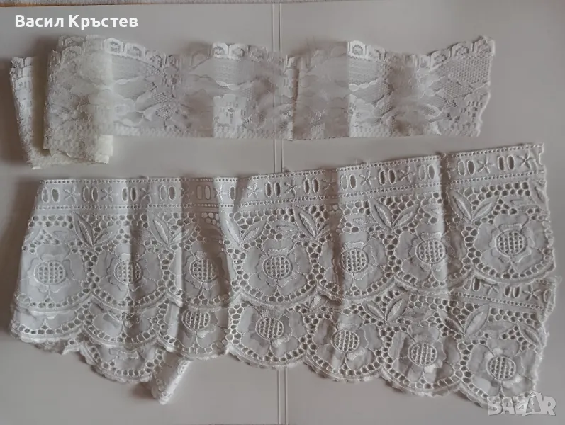 1. Памучна бяла, с рязана шевица, обточена с копринени конци, плътна, дължина 1 л. м. (105 см.), широчина 9,8 см. Цена: - 6.00 лв.