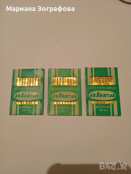 С. 1. Три комплекта Игли "Акра", за кръстат шев с връх 360736, Чехословакия, 50-те год., в зелена опаковка.